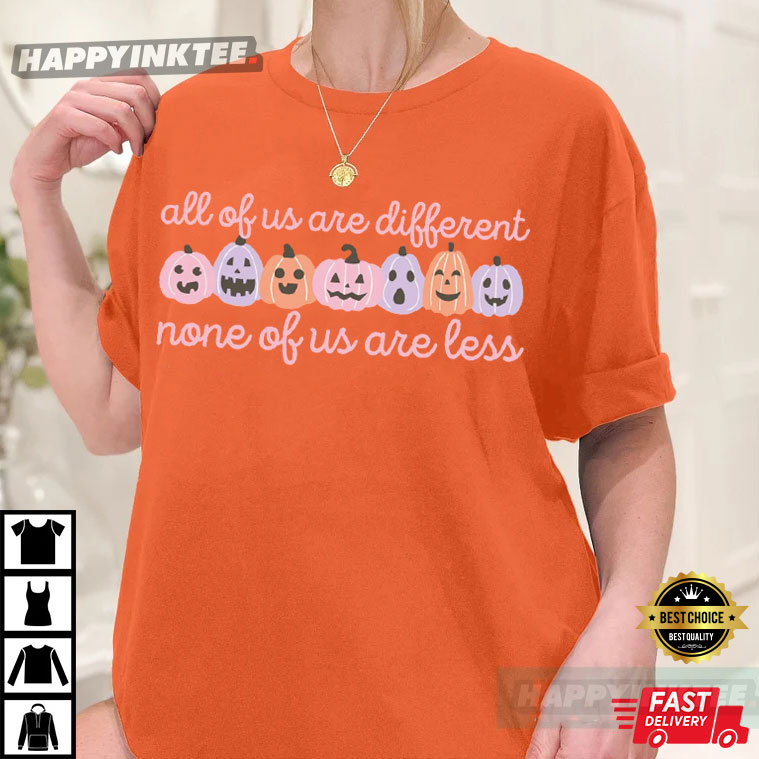 Embrace diversity this Halloween with the All Of Us Are Different None of Us Are Less T-Shirt. It has a fun lineup of colorful, quirky pumpkins and a sweet message that spreads good vibes, kindness, and inclusion—great for Halloween and anytime really.