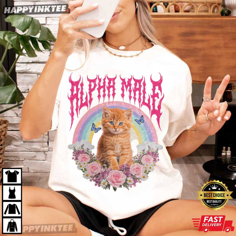 If you love humor that flips expectations, this Alpha Male Funny Kitten Ironic Cat Meme Gift For Cat Lover T-Shirt is exactly your vibe — At first glance, the bold “alpha male” typography screams dominance — but then you notice the adorable orange kitten sitting sweetly beneath a soft rainbow and floral frame. This design’s compelling contrast is that it celebrates softness, attractiveness, and personality while lightheartedly mocking the “alpha male” stereotype.