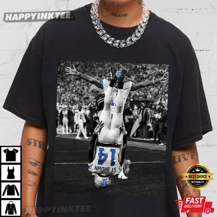 Check out this Amon Ra St Brown Funny Celebration Detroit Lions Football T-Shirt that pays tribute to the unforgettable personality of Amon-Ra St. Brown. It has a cool black-and-white graphic of St. Brown doing his famous upside-down touchdown celebration, with some awesome Honolulu blue highlights. It’s a must-have for fans who enjoy football and a good time.