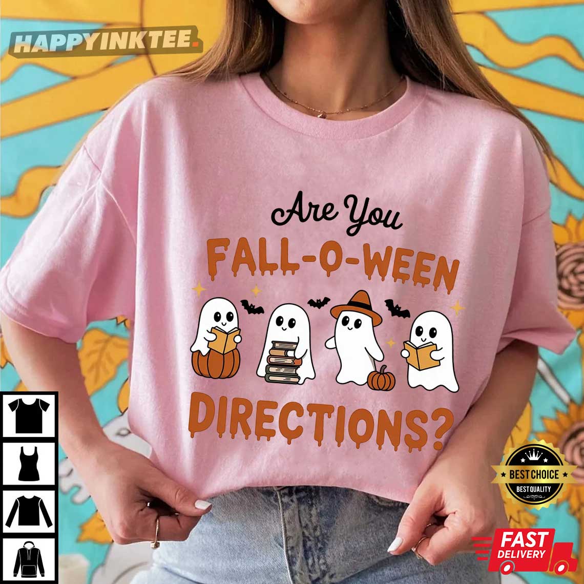 This fun design showcases four cute cartoon ghosts hanging out with pumpkins, books, and witch hats. It’s a lighthearted tribute to all the teachers out there who find themselves giving the same directions over and over, especially when Halloween rolls around!
