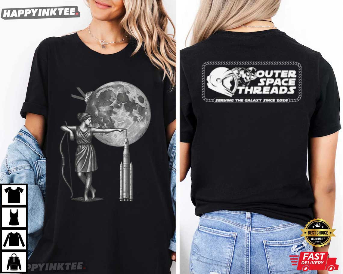 Blend ancient mythology with modern space exploration in our Artemis II Moon Goddess With Rocket Outer Space Threads T-Shirt — This striking black double-sided tee captures the spirit of NASA’s Artemis II mission with a powerful, artistic design that space fans and mythology lovers will appreciate.