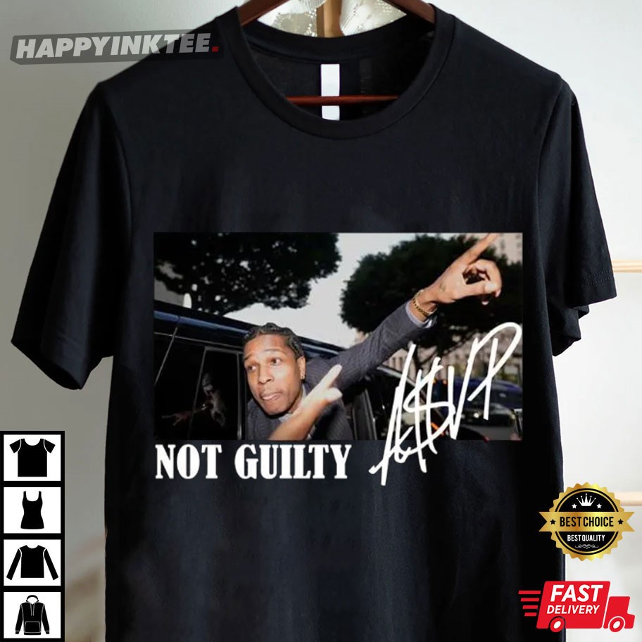“NOT GUILTY” directly references ASAP Rocky’s legal troubles and his eventual acquittal, making this ASAP Rocky Not Guilty Signature Hip Hop T-Shirt a celebratory or defiant statement.
