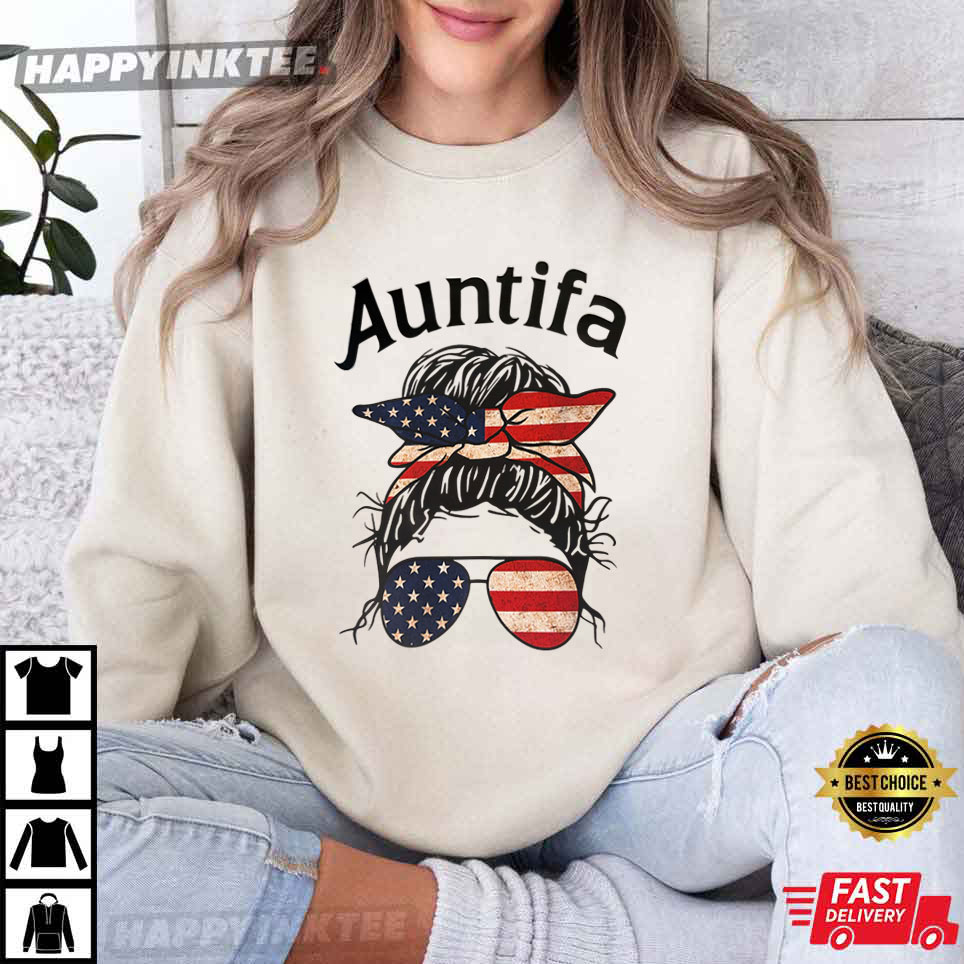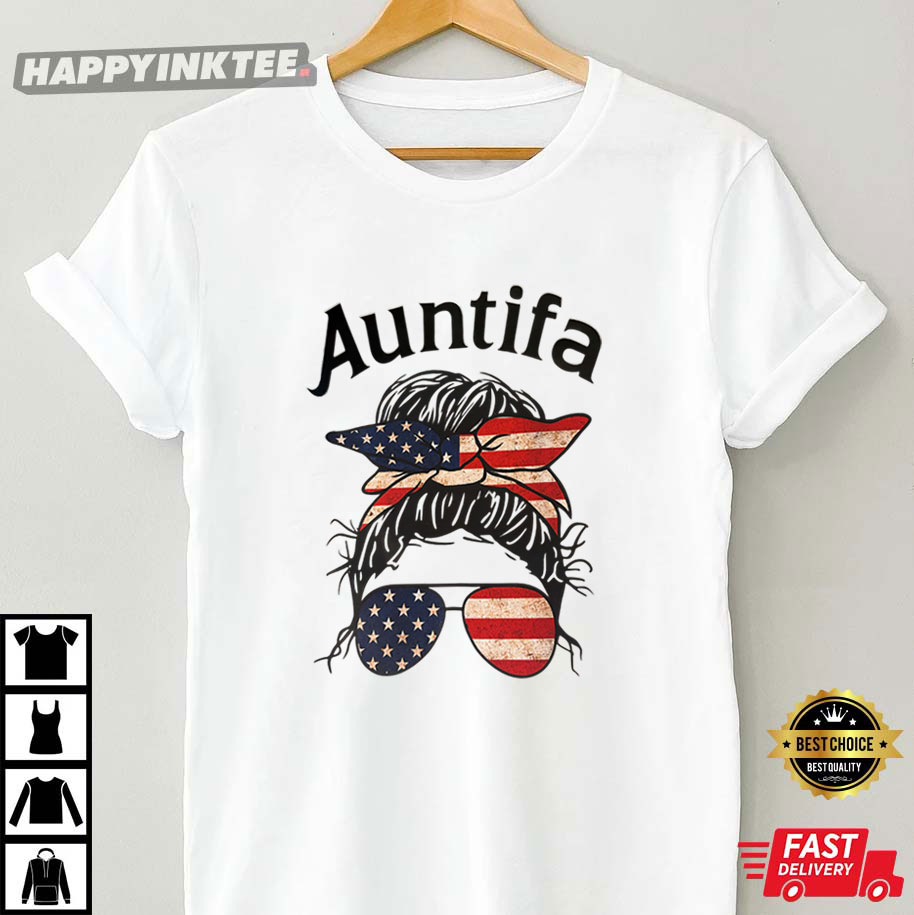 The Auntifa Anti Fascism Messy Bun T-Shirt is perfect for all the fearless aunts out there who get that freedom is about taking a stand against hate — and looking fabulous while doing it. This design rocks a retro messy bun, an American flag bandana, and matching sunglasses, bringing some fun and flair to your anti-fascist vibe.