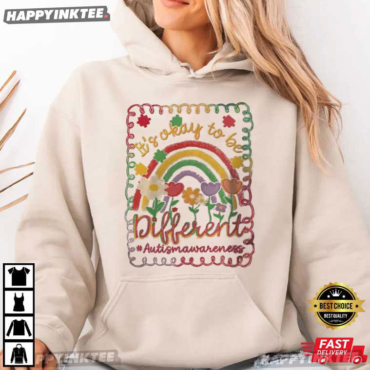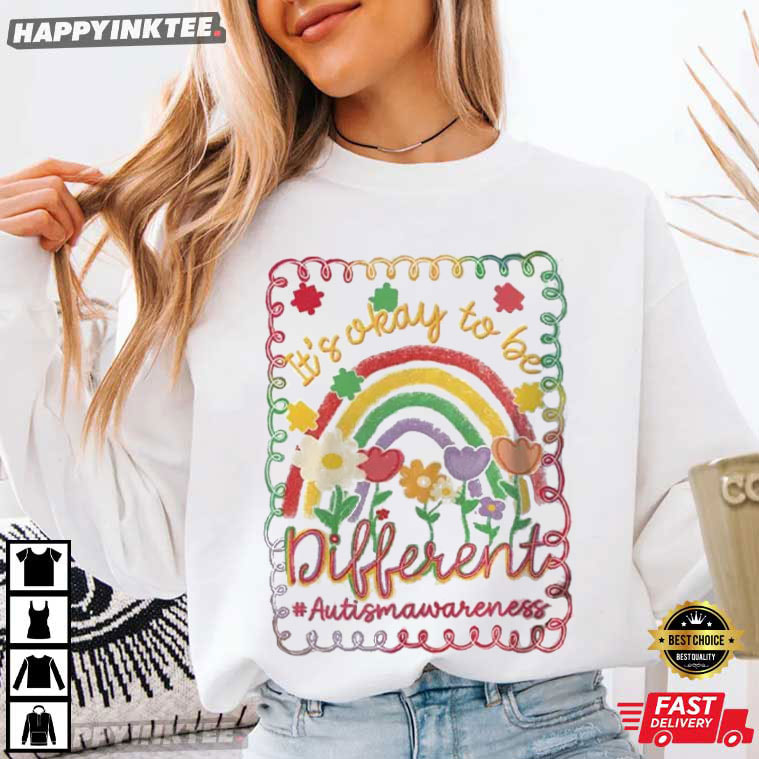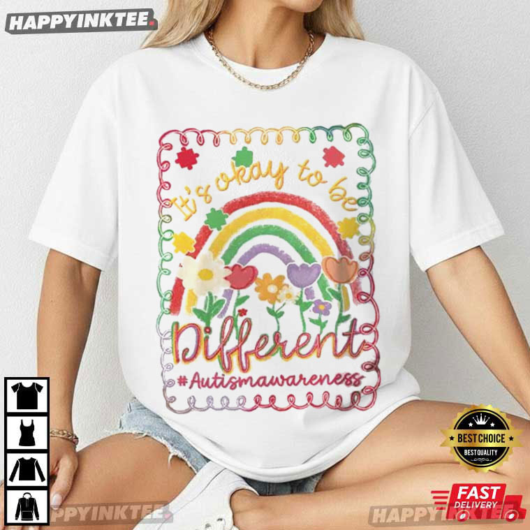 Bright, uplifting, and full of heart—the Autism Awareness It’s Okay to Be Different Preppy Girly Rainbow T-Shirt is designed to celebrate individuality in the most joyful way — With its soft pastel tones and playful hand-drawn style, this tee delivers a message that matters: being different isn’t just okay—it’s beautiful.