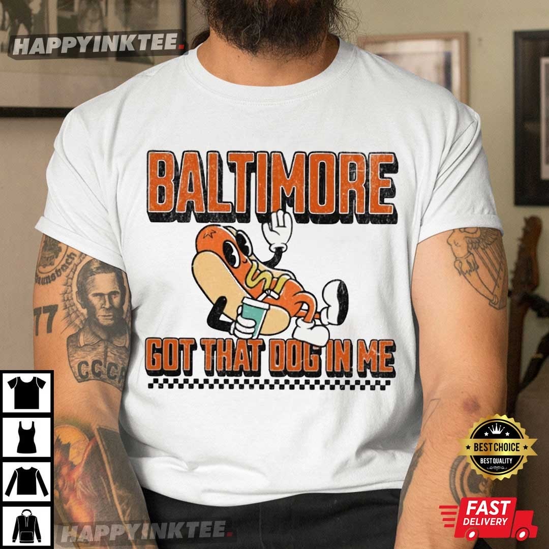 “Baltimore Got That Dog In Me” carries a metaphorical meaning and reflects the pride and resilience of the people of Baltimore, particularly in connection to the Baltimore Orioles baseball team. In sports culture and daily life, the expression “got that dog in me” is frequently used to denote resolve, a fighting spirit, and perseverance—qualities often likened to a strong, loyal, and unyielding dog.
