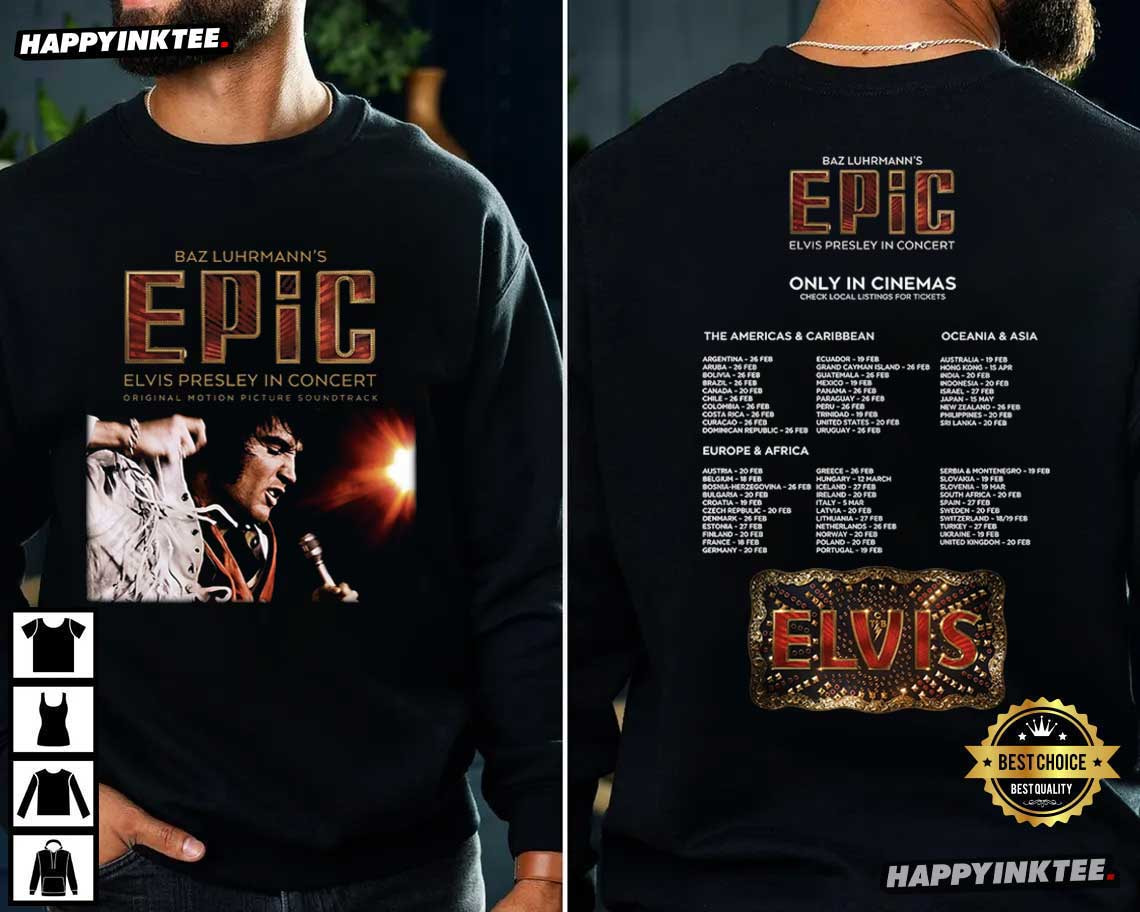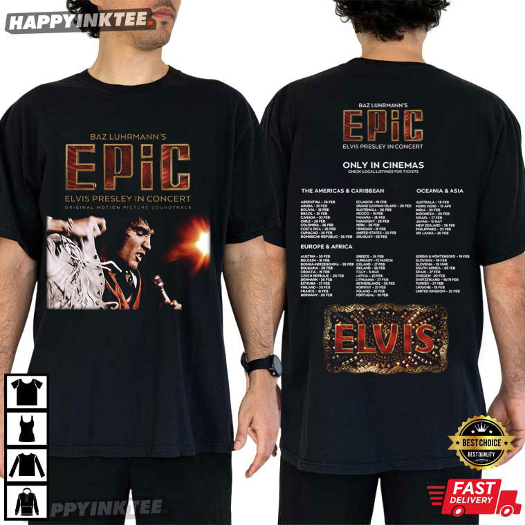 Get the Baz Luhrmann EPiC Elvis Presley in Concert 2026 Movie T-Shirt to honor the timeless legacy of rock and roll — a bold tribute to one of the most influential performers in music history. Inspired by the cinematic storytelling style of acclaimed director Baz Luhrmann and the unforgettable stage presence of Elvis Presley, this shirt captures the electrifying spirit of a live Elvis performance and the spectacle of modern music cinema.