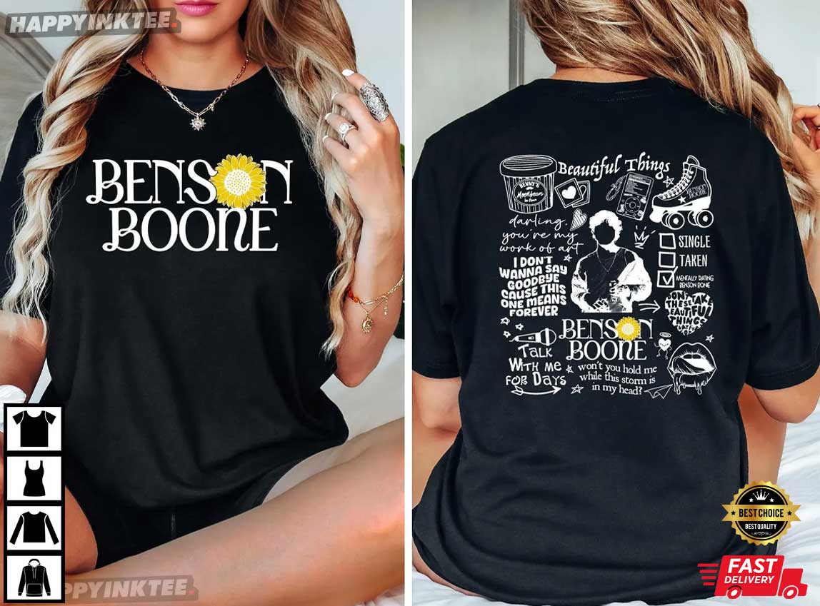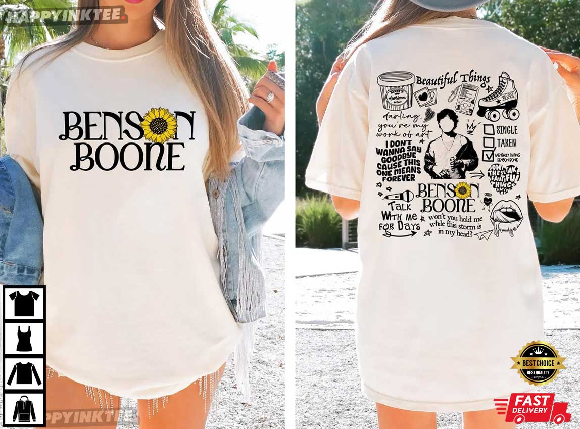 Show off your love for Benson Boone’s amazing lyrics with this Benson Boone Lyrics Fan Gift T-Shirt. It has his name front and center with a cool sunflower graphic, plus a fun mix of iconic song lyrics, doodles, and motifs on the back. It’s the perfect way for fans to celebrate his emotional music and amazing performances.