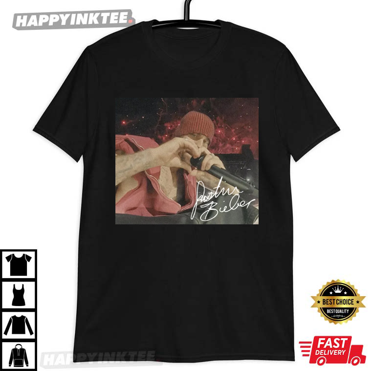This Justin Bieber fan merch has a rough, artistic edge. The background is dreamy and almost cosmic. The handwritten-style signature adds a personal touch, making it feel like a collectible piece rather than just merch.
