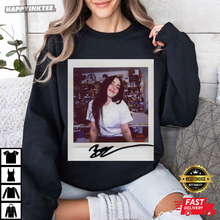 Get this Billie Eilish Iconic Polaroid Music T-Shirt to honor Billie Eilish’s distinctive aesthetic and creative abilities! The use of a Polaroid-style image on the Billie Eilish graphic tee reflects a nostalgic, vintage feel, aligning with Billie’s alternative and moody artistic persona. The signature at the bottom of the Polaroid adds authenticity, making it look like an autographed fan keepsake. Fans of Billie Eilish, who respect her for her unvarnished and authentic style, may find this design approach appealing.