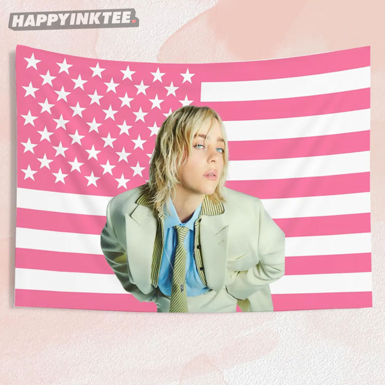 The Billie Eilish Photo Music Pink US Flag Wall Tapestry will completely change your room! The Billie Eilish wall tapestry is a bold and stylish representation of the artist’s signature aesthetic, blending patriotism with her edgy and fashion-forward persona. Her oversized beige suit, blue shirt, and loosely tied striped tie are a signature style choice that represents her bold, non-conformist approach to fashion. It is made of sturdy, lightweight fabric, is simple to hang, and adds a striking, fashionable touch to any room.