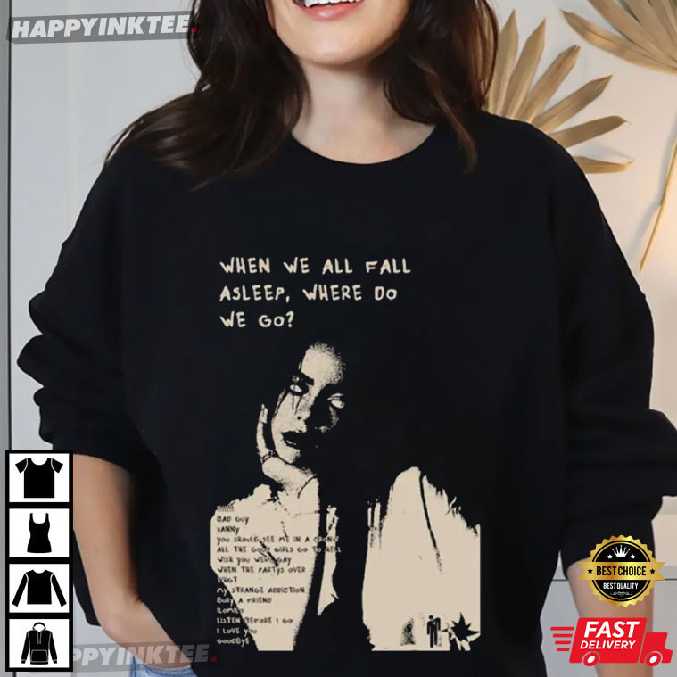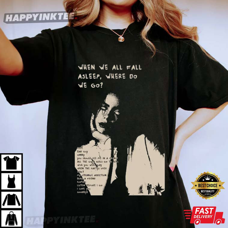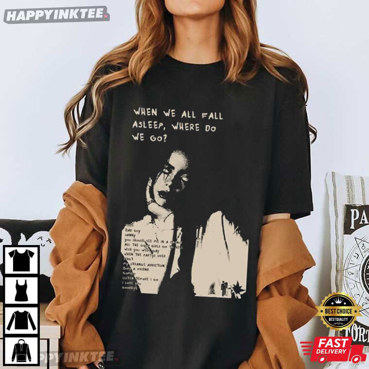 If you’ve followed Billie Eilish from her early bedroom-pop days to her chart-topping world tours, this Billie Eilish World Tour 2026 Concert Gift for Music Lovers T-Shirt is the perfect way to celebrate her next era. Featuring a striking monochrome portrait and the handwritten-style text from her When We All Fall Asleep, Where Do We Go? album aesthetic, Fans will identify this Billie Eilish t-shirt‘s dark, dreamy vibe right away.