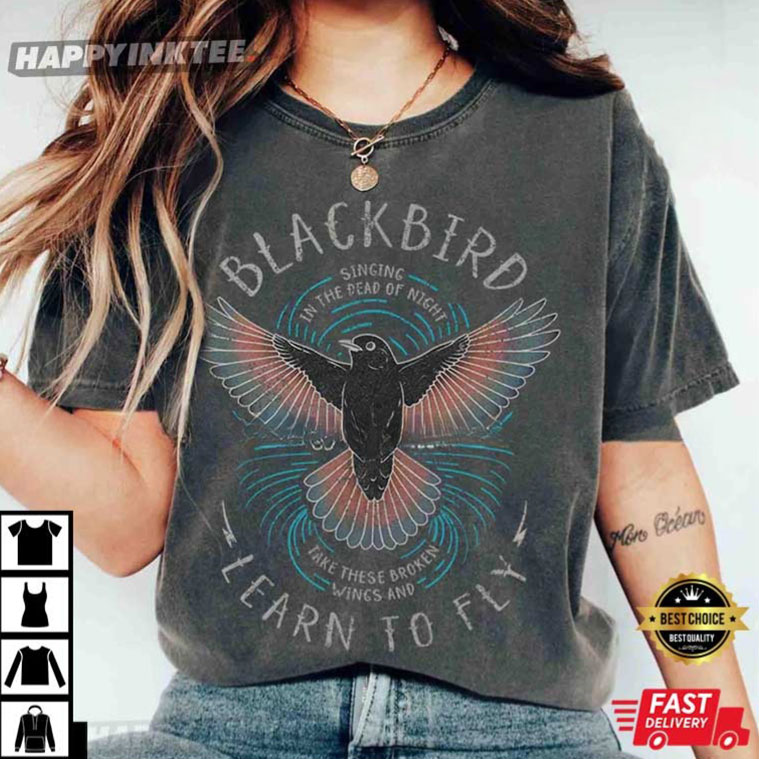 “Take these broken wings and learn to fly.” Our Blackbird T-Shirt is a nod to one of The Beatles‘ most loved songs, perfectly reflecting its vibe of hope, healing, and freedom.