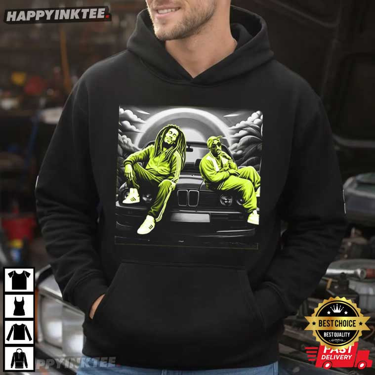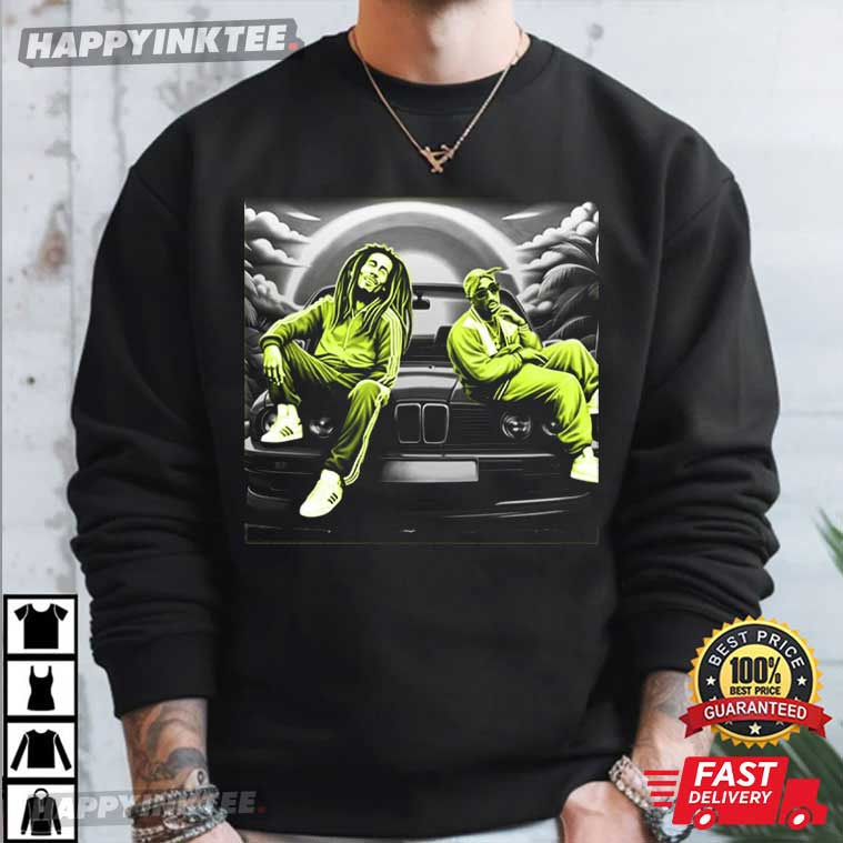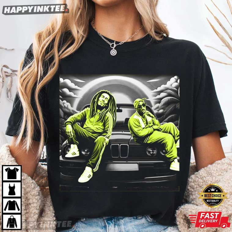 The Bob Marley 2 Pac Jordan Air Max 95 Big Bubble Streetwear T-Shirt blends music legacy, sneaker culture, and classic streetwear aesthetics into one powerful graphic design — Inspired by two legendary figures who shaped global music and culture, this shirt captures the rebellious spirit of reggae and hip-hop while connecting it with modern sneaker fashion. The striking neon-style graphic creates a timeless and nostalgic cinematic atmosphere by depicting two famous painters lounging on the hood of a vintage car beneath a luminous moon.