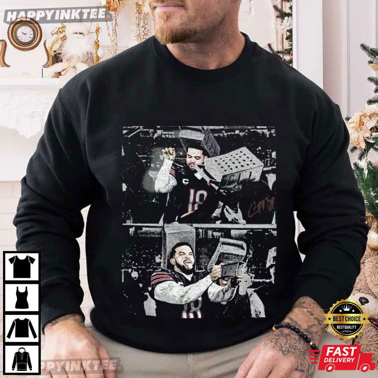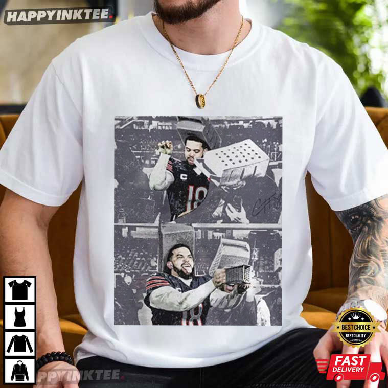 The Caleb Williams Shredding Cheese Funny Chicago Football T-Shirt is pure Chicago football humor—bold, confident, and perfectly timed. The graphic captures a meme-worthy moment featuring Caleb Williams in a playful “cheese-grating” scene that instantly reads as rivalry energy— with its gritty, high-contrast photo collage style, the design feels like something pulled straight from fan culture rather than polished league merch.