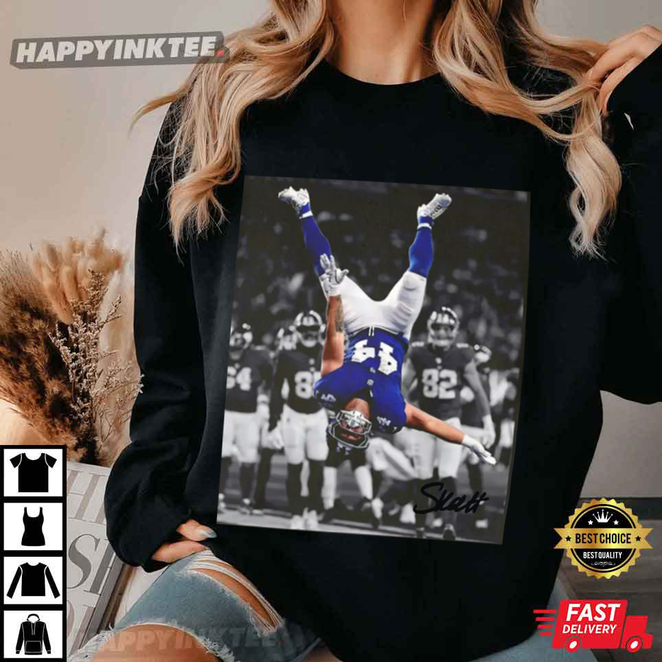 This football celebration shirt shows an action shot of Cam Skattebo’s epic backflip celebration, caught in midair. It’s a cool mix of strength, control, and excitement that really captures his playmaking vibe. Wear it as a tribute to big plays, big energy, and the kind of confidence that flips the game upside down — literally.