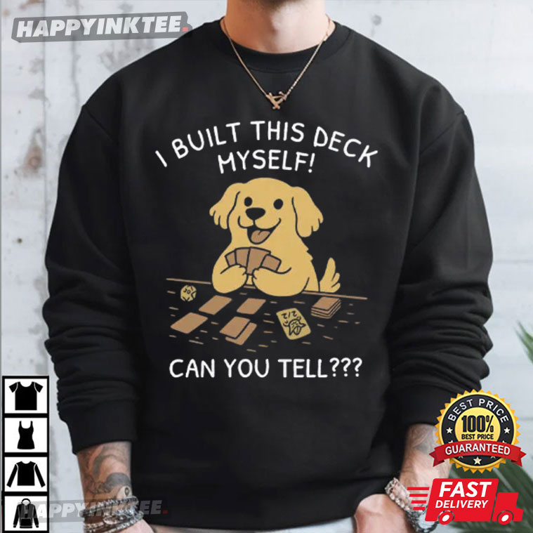 This Card Game I Built This Deck Myself Can You Tell T-Shirt is just right for gamer dads, deck-building enthusiasts, or anyone who loves a good pun. It features a cheerful cartoon dog holding playing cards, ready to ask, “I built this deck myself, can you tell?”