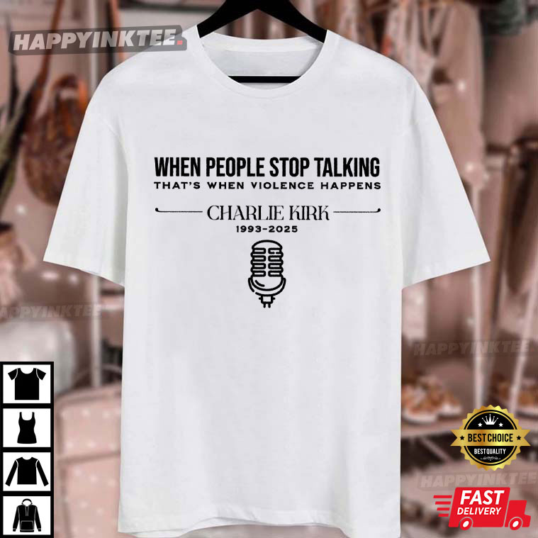 Charlie Kirk, co-founder of Turning Point USA, was tragically killed on September 10, 2025, during the kickoff of his “American Comeback Tour” in Utah. Take a moment to remember Charlie Kirk and his message with this Charlie Kirk Memorial T-Shirt. It has his quote, “When people stop talking, violence happens.”