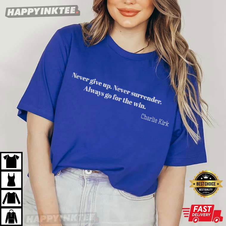 Check out the Charlie Kirk Never Give Up Quote Motivational T-Shirt, showcasing one of his powerful messages: “Never give up. Never surrender. Always go for the win.”