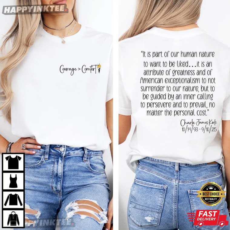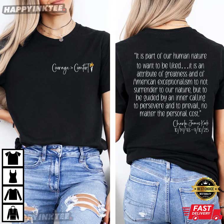 Rock your beliefs with the Charlie Kirk Turning Point Quote Courage Patriot T-Shirt. On the front, it has the phrase “Courage > Comfort” along with a cool torch graphic, and the back showcases one of Charlie Kirk’s inspiring quotes about perseverance, greatness, and American exceptionalism.