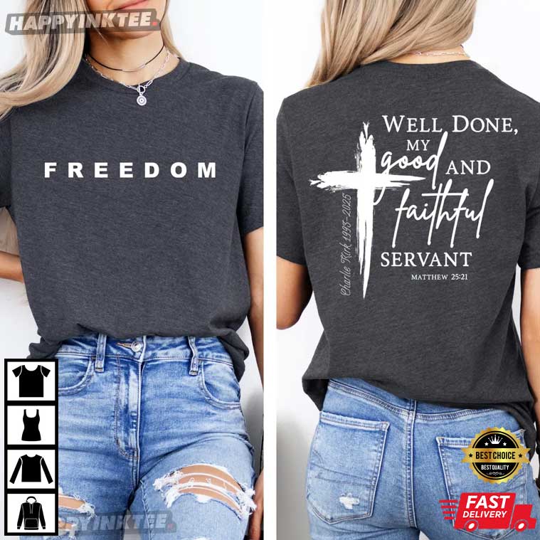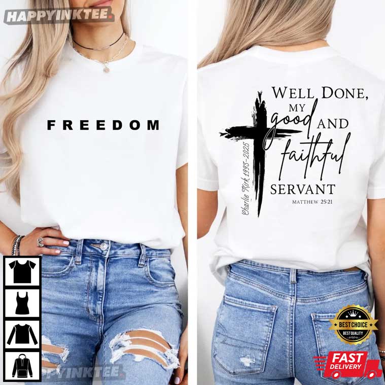 Show off your faith and freedom with this Charlie Kirk Well Done Good And Faithful Servant Christian T-Shirt. It showcases Matthew 25:21 in bold script with a cross graphic, making it a great way for believers to share their faith and find some encouragement.