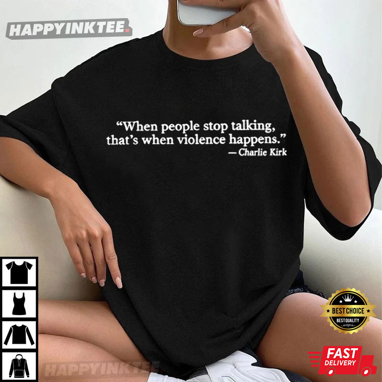Spread the word that people should talk to each other with the Charlie Kirk When People Stop Talking Quote T-Shirt. This design, which has the words “When people stop talking, that’s when violence happens,” shows that Kirk thought that open conversation, not silence, made society healthier.