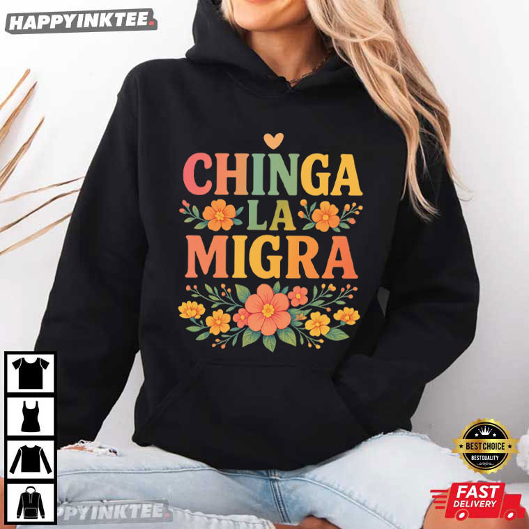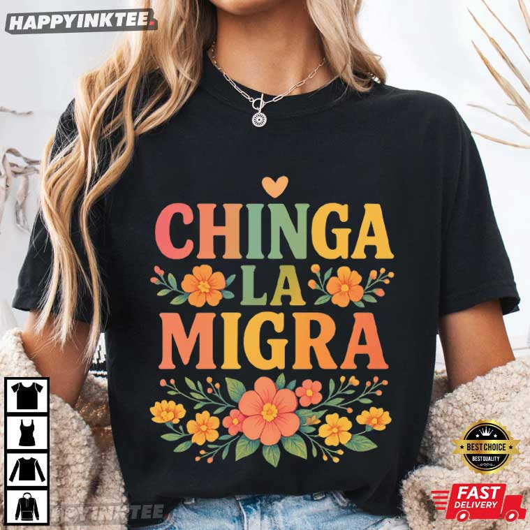 Bright, defiant, and rooted in culture, the Chinga La Migra Abolish ICE No Human Is Illegal Pro Immigrant T-Shirt transforms a powerful political statement into wearable art. The phrase “Chinga La Migra”, rendered in bold retro lettering and surrounded by warm floral illustrations, blends resistance with beauty— transforming protest into a proud, visible, and unapologetically human endeavor. If you’re looking for a pro-immigrant t-shirt that clearly supports Abolish ICE and affirms that no human is illegal, this design delivers its message with strength, culture, and intention.