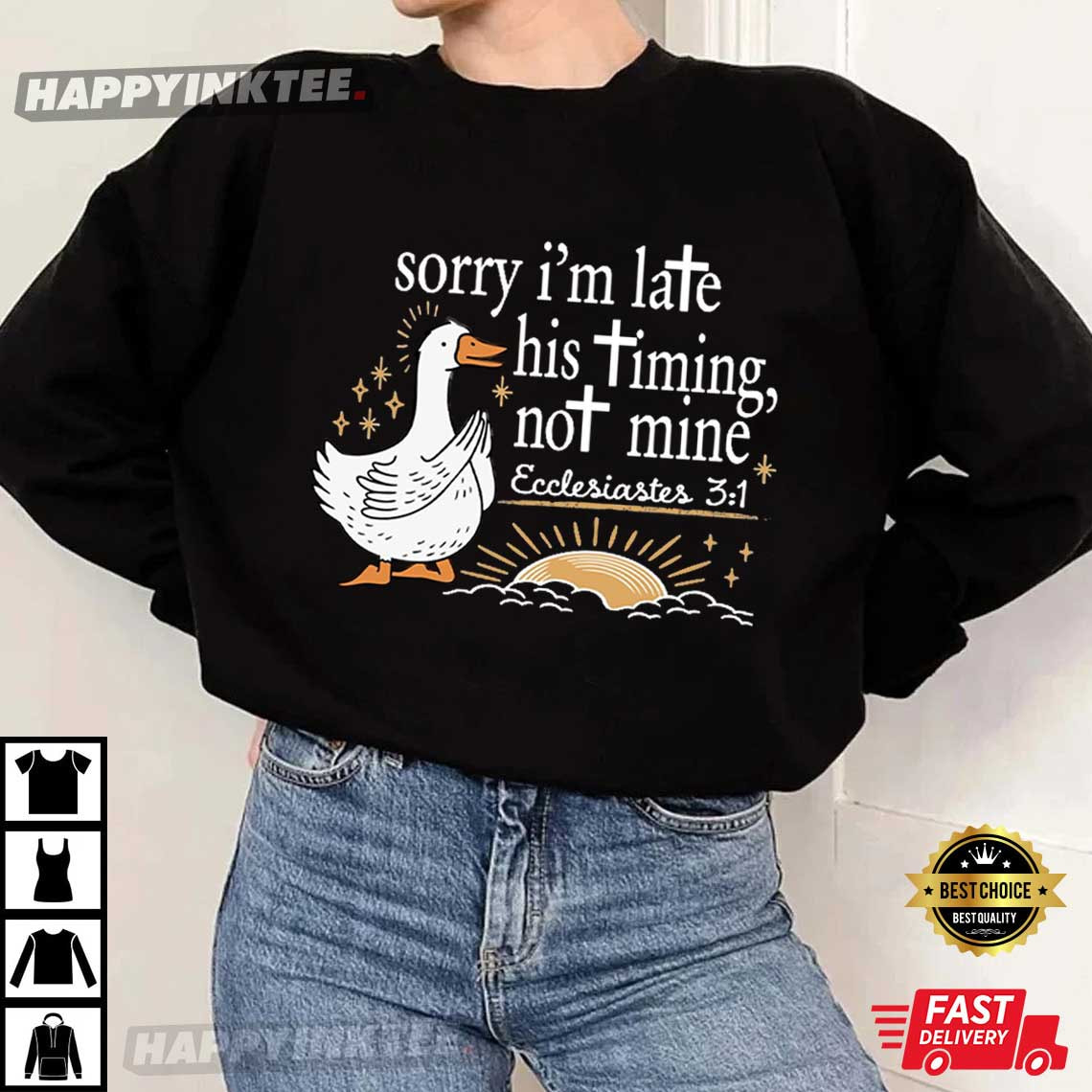 Christian Sorry I'm Late His Timing Not Mine Ecclesiastes 31 Bible Verse T-Shirt – vintage fashion t shirts, vintage graphic t shirts, graphic t shirts vintage, retro graphic t shirts, unique graphic t shirts, retro tee shirts, vintage 80s t shirts, custom apparel