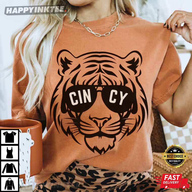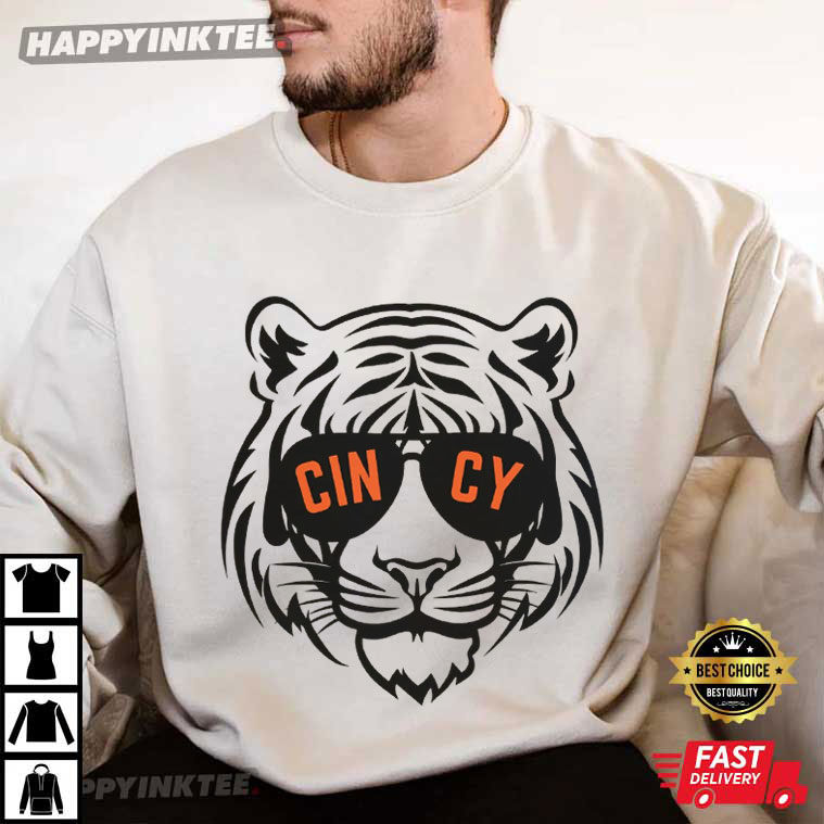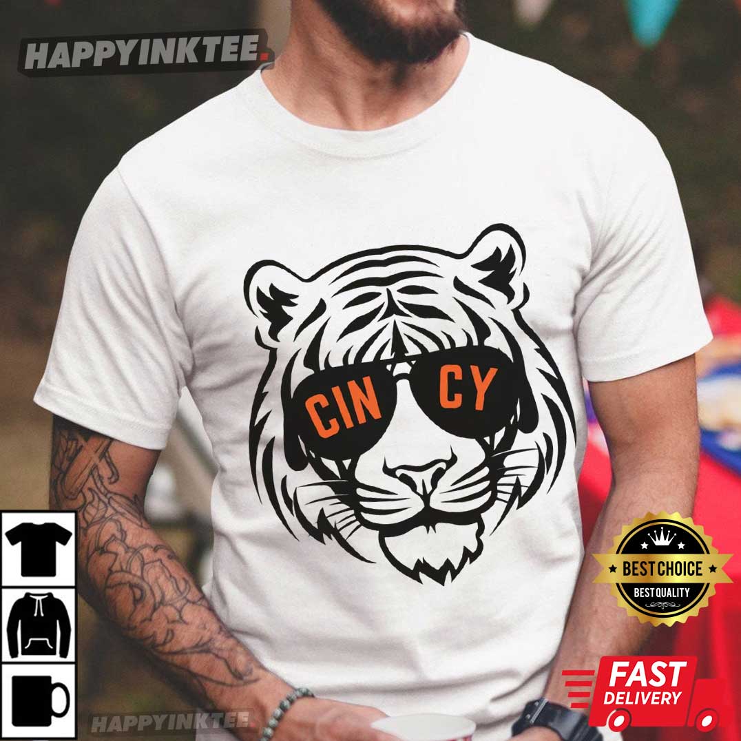 This Cincy Sports Fan T-Shirt for the Cincinnati Bengals Football will help you show your team spirit in style. It is a great mix of team spirit and a cool, casual vibe, with a big tiger picture and the word “CINCY” written across the shades.
