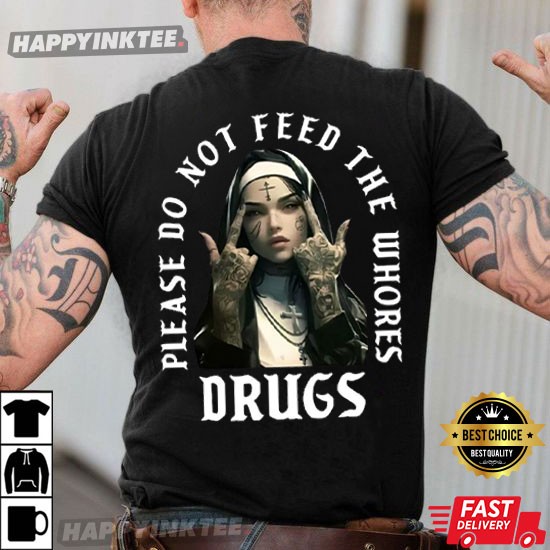 Shop the Cool Nun Please Do Not Feed The Whores Drugs Meme T-Shirt! The design features an image of a nun with tattoos and an edgy appearance, which contrasts sharply with the traditional image of nuns as symbols of purity and religious devotion.