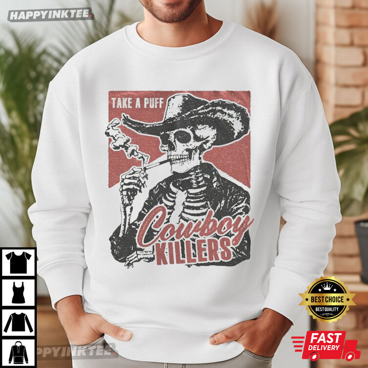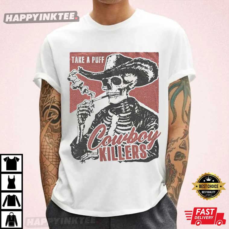 Ride into the wild side of style with this Cowboy Killers T-Shirt, which shows a skeletal cowboy rocking a wide-brimmed hat and puffing on a cigarette, totally capturing that rebellious, outlaw vibe of the Wild West—where danger, dust, and freedom all come together.