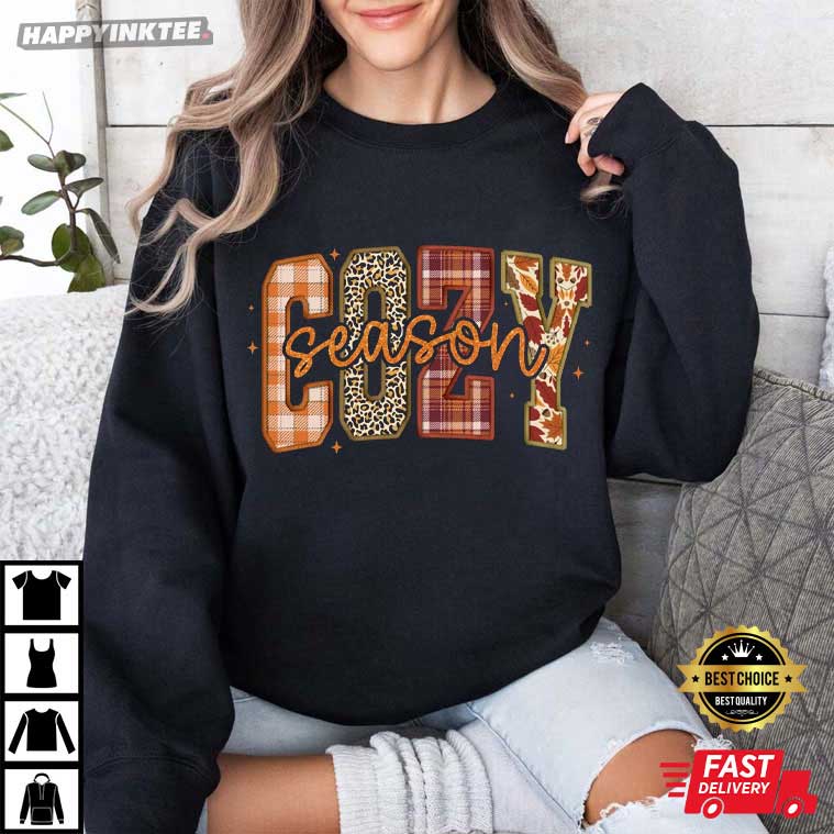 Get ready for autumn vibes with the Cozy Season Retro Fall T-Shirt. This fall gift idea is great for the warm weather because it has big retro letters and patterns of plaid, leopard, gingham, and fall leaves.