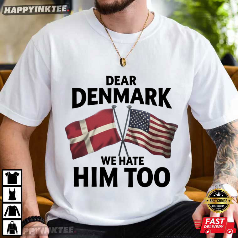 Front and center, the shirt features the message “Dear Denmark, We Hate Him Too”, paired with crossed Danish and American flags. The layout is simple, clean, and impossible to miss. There’s no long explanation, no slogan overload—just a blunt, comedic statement that lands immediately.