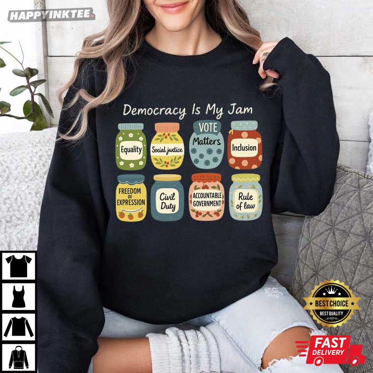 Rock your civic pride with the Democracy Is My Jam Equality Political Statement T-Shirt. It has fun jam jar graphics with labels like Equality, Social Justice, Freedom of Expression, Civil Duty, and more—it’s a cool way to show support for democracy and inclusion.