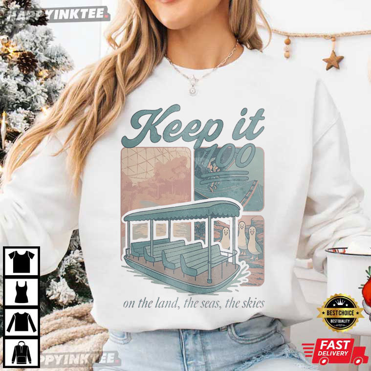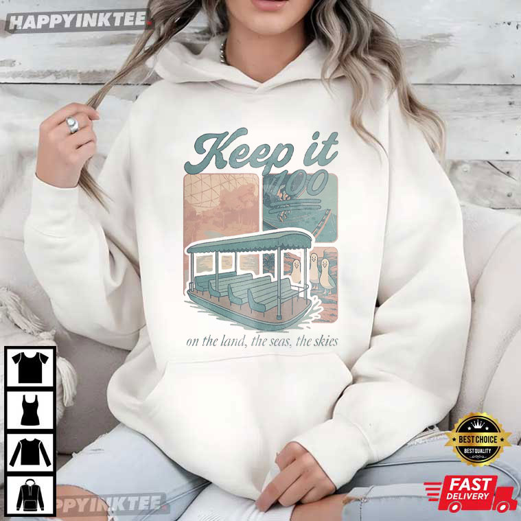 The Disney Keep It 100 On The Land The Seas The Skies T-Shirt is for fans who appreciate the journey as much as the goal. It’s relaxed, nostalgic, and full of Disney charm.