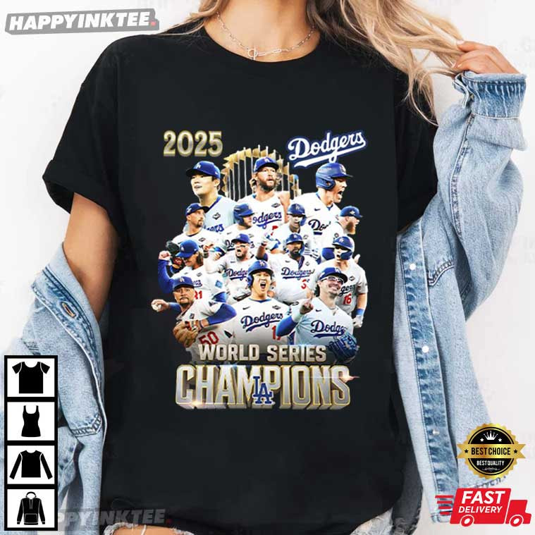 Celebrate victory in true blue style with this Dodgers 2025 World Series Champions LA Baseball T-Shirt! The enthusiasm, pride, and dominance of the Dodgers‘ historic season are captured in this t-shirt, which features an epic collage of LA’s top players and the recognizable championship trophy. Whether you’ve followed every inning or just love LA baseball, this is the must-have shirt for true fans of the champs.