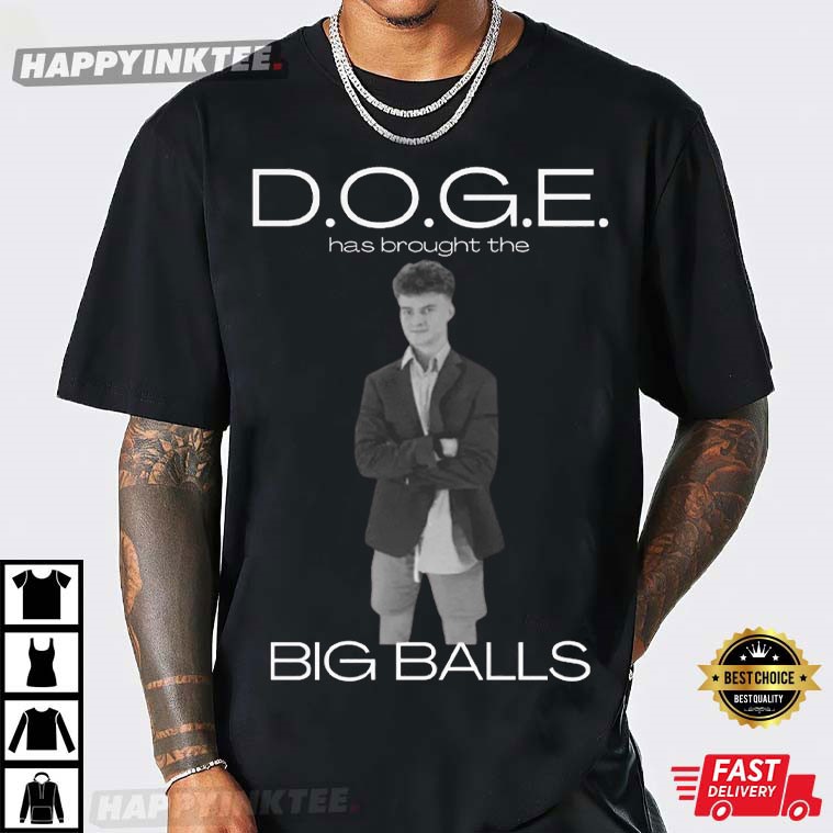 The Doge Has Brought The Big Balls Funny Political T-Shirt is funny, political satire, and a bit of internet culture all at the same time. It has a big, eye-catching picture of a young guy in a suit that says “D.O.G.E. has brought the BIG BALLS.”