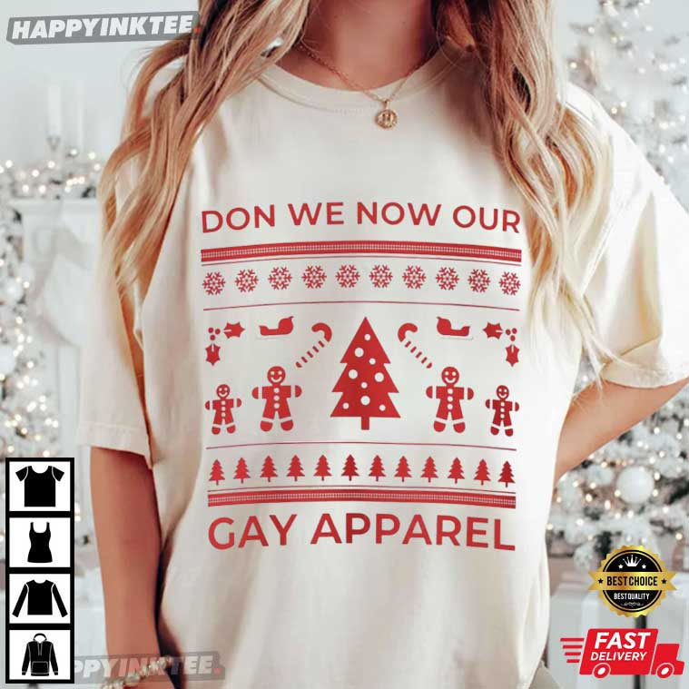 The Don We Now A traditional Christmas lyric is given a happy, inclusive twist with our Don We Now Our Gay Apparel Lesbian Gay Funny LGBT T-Shirt. Styled like a traditional holiday sweater pattern, the design features gingerbread people, candy canes, snowflakes, Christmas trees, and cozy winter icons all arranged in a bold red graphic that pops off the shirt. It’s playful, welcoming, and full of personality exactly the kind of shirt that sparks smiles and starts conversations.