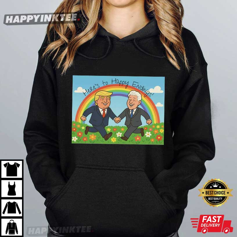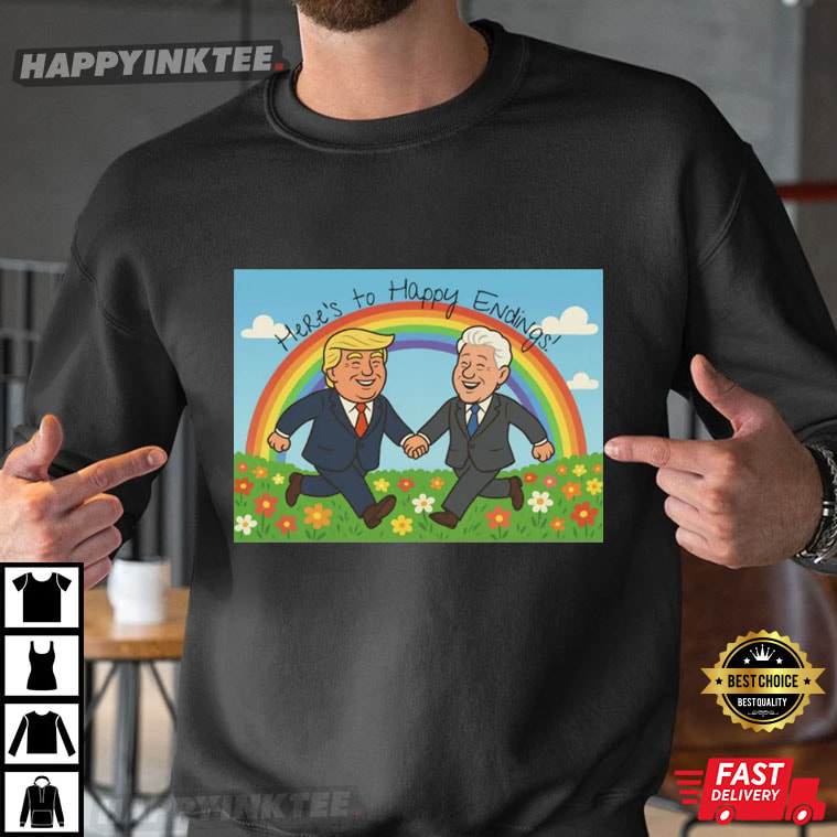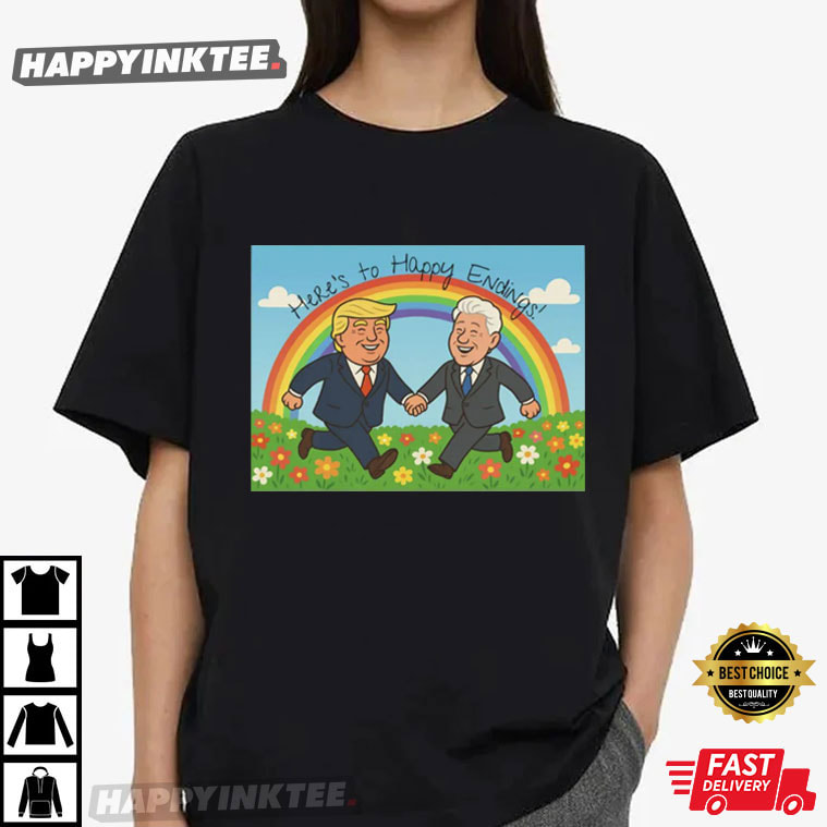 This Donald Trump Bill Clinton Here’s To Happy Endings Blowing Bubba T-Shirt brings political humor to a whole new level with a playful cartoon-style illustration. The design shows two cheerful, suit-wearing characters holding hands under a rainbow with flowers around them, all wrapped in lighthearted satire that pokes fun at political drama without taking sides. Whether you’re into political memes, ironic graphic tees, or parody designs that keep conversations lively, this Funny Political parody shirt absolutely delivers.