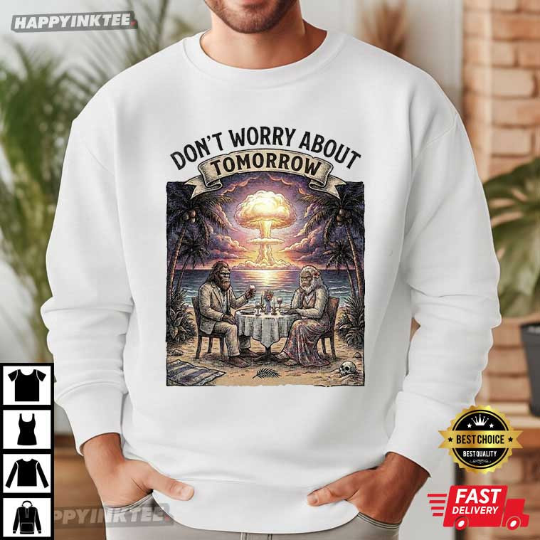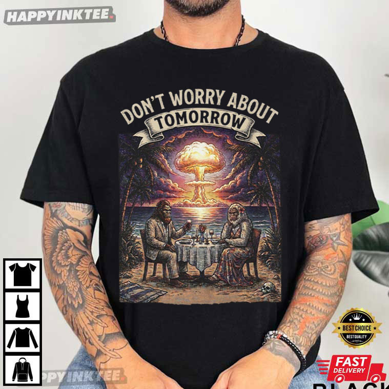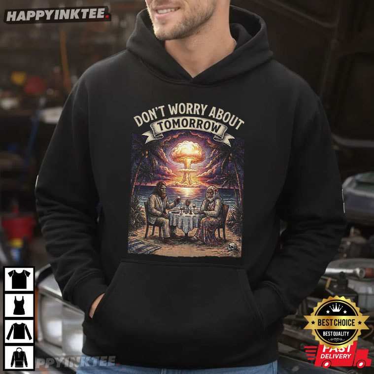 The Don’t Worry About Tomorrow Funny Nuclear Explosion Gorilla T-Shirt is a dark-humor graphic tee that blends surreal art with ironic comedy. This design provides a startling contrast between chaos and calm by showcasing an unexpected scenario of two gorillas peacefully eating dinner on a beautiful beach while a gigantic nuclear explosion builds in the backdrop. The bold phrase “Don’t Worry About Tomorrow” adds a layer of caustic comedy, making the whole picture a witty reflection on being present — With its dramatic imagery and ironic message, it’s the ideal option for anyone who like striking, unusual graphic t-shirts that draw attention.