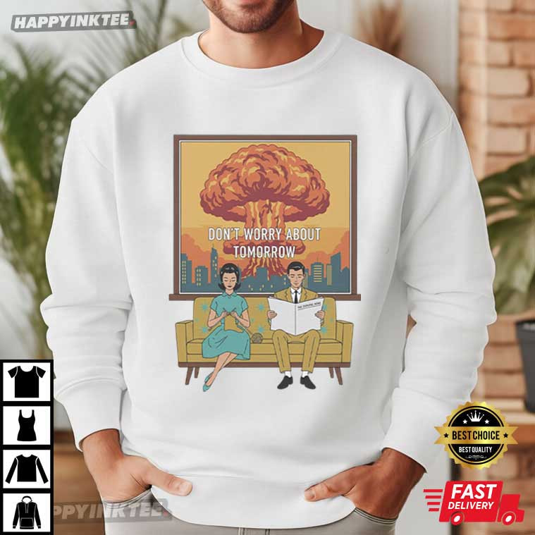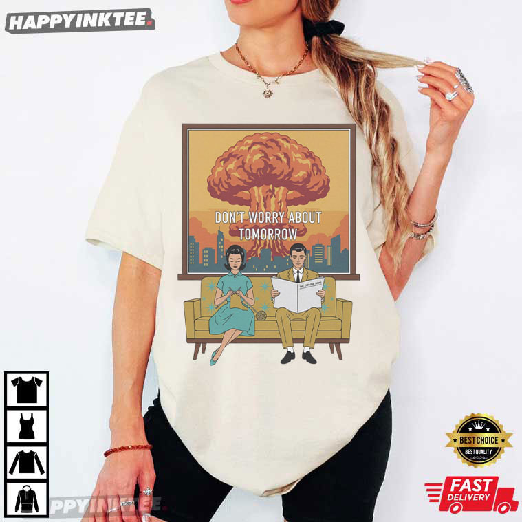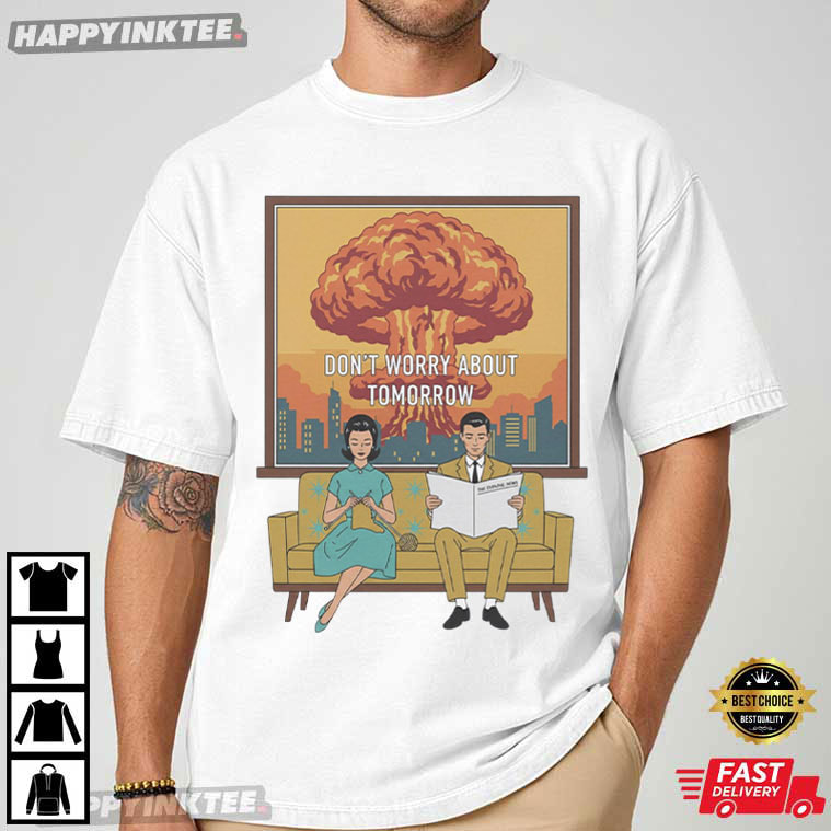 The Don’t Worry About Tomorrow Matthew 6 34 Nuclear Explosion Meme T-Shirt is a striking graphic tee that blends vintage illustration style, dark humor, and a thought-provoking biblical reference. This design effectively contrasts chaos and tranquility with a vintage scene of a peaceful couple sitting together while a giant mushroom cloud erupts in the backdrop. The phrase “Don’t Worry About Tomorrow” references the well-known verse Matthew 6:34, making the design both ironic and reflective at the same time. Its ironic message reminds viewers to focus on the present moment— even when life feels chaotic.