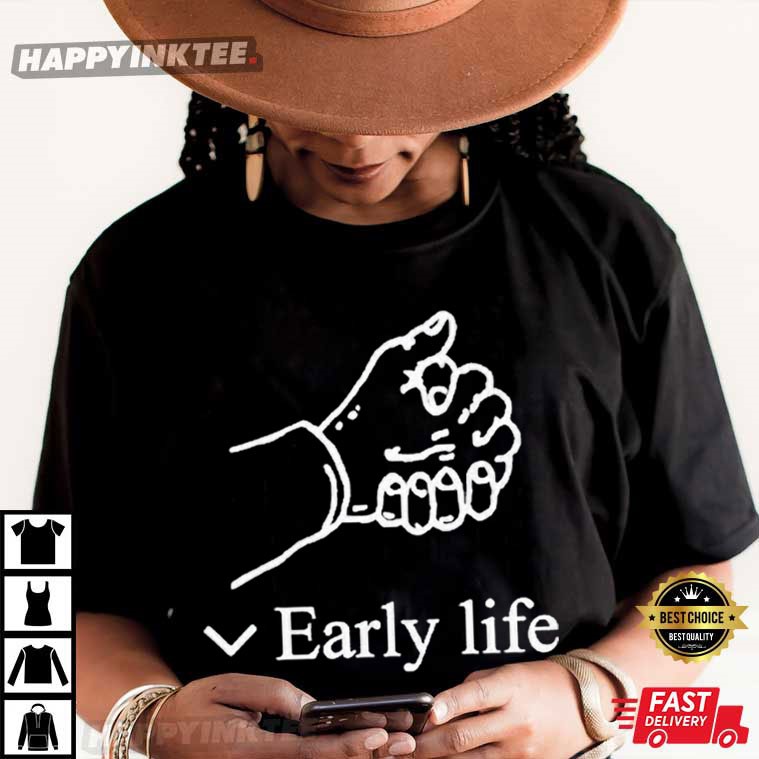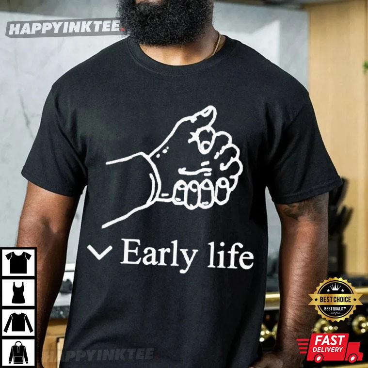 The Early Life Hold Hand T-Shirt, a sentimental and nostalgic design that evokes the times when holding hands was all we needed for protection, love, and comfort, allows us to embrace the simplicity of childhood. “Early Life” is a well-known internet meme that references a common trend in Wikipedia biographies, where people often check an individual’s early background for context on their upbringing and influences. The combination of “Early Life” with the hand-holding imagery may hint at how people are influenced from a young age, this might just be an absurdist jest with no real significance, leaving room for a variety of interpretations.
