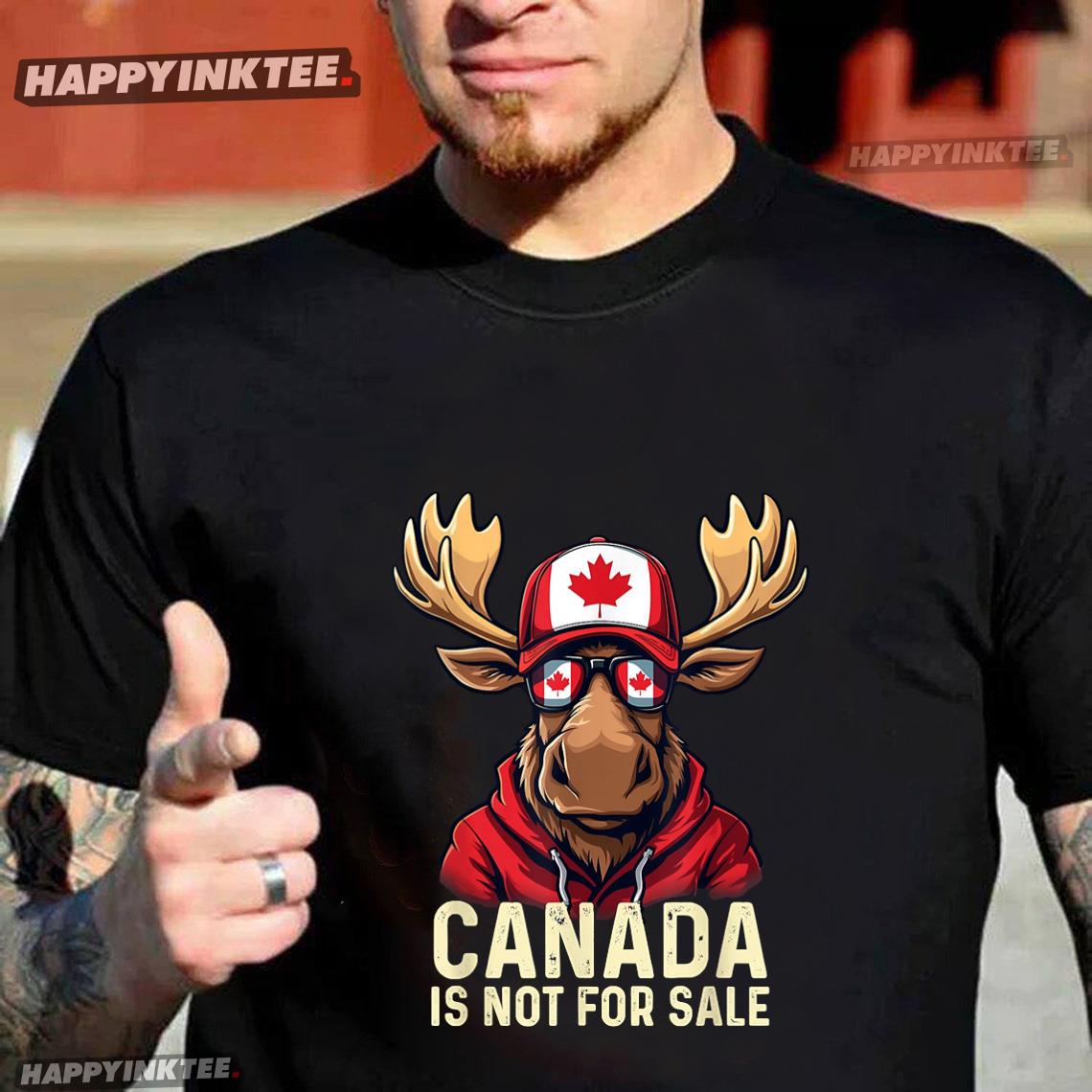With the Elk Canada Is Not For Sale Canadians Strong And Free T-Shirt, you can flaunt your Canadian pride. The elk is depicted wearing a red hoodie, a red baseball cap with the Canadian flag (a red maple leaf on a white background), and sunglasses with the Canadian flag design on the lenses. “Canada Is Not For Sale” is a bold, patriotic statement asserting Canadian sovereignty, independence, and resistance to foreign influence or exploitation. It suggests a stance against selling out Canadian resources, culture, or autonomy—possibly in response to economic, political, or environmental concerns. Wear it for outdoor activities, Canada Day, or just plain pride!