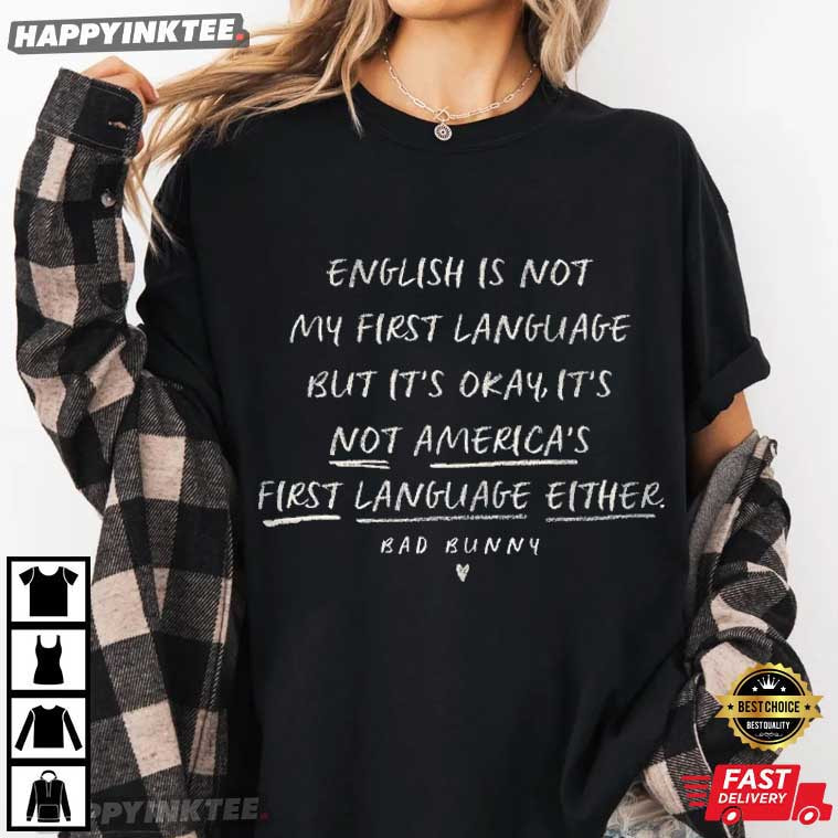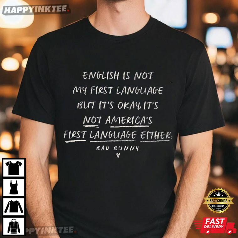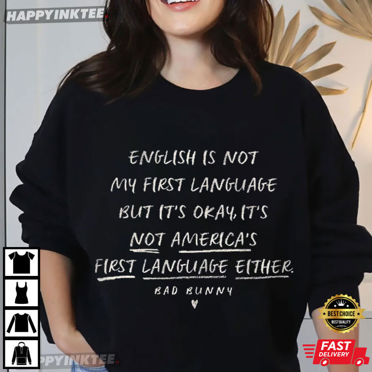 This English Is Not My First Language It’s Not America’s Bad Bunny T-Shirt draws inspiration from the cultural voice of Bad Bunny, their influence around the world has contributed to the music industry’s change from using English as the standard language to embracing linguistic variety.