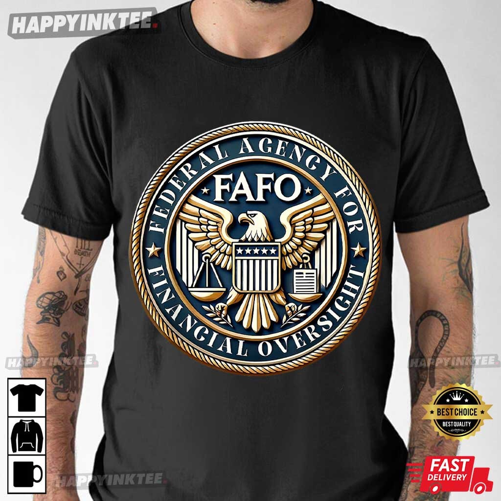 Make a bold statement with the FAFO Federal Agency For Financial Oversight T-Shirt—a clever twist on the viral FAFO (Find Out) meme, combining humor with a hint of cynicism about bureaucracy. The emblem resembles a legitimate U.S. government seal, featuring a bald eagle, a shield, a balance scale, and documents—symbols often associated with authority, law, and oversight.