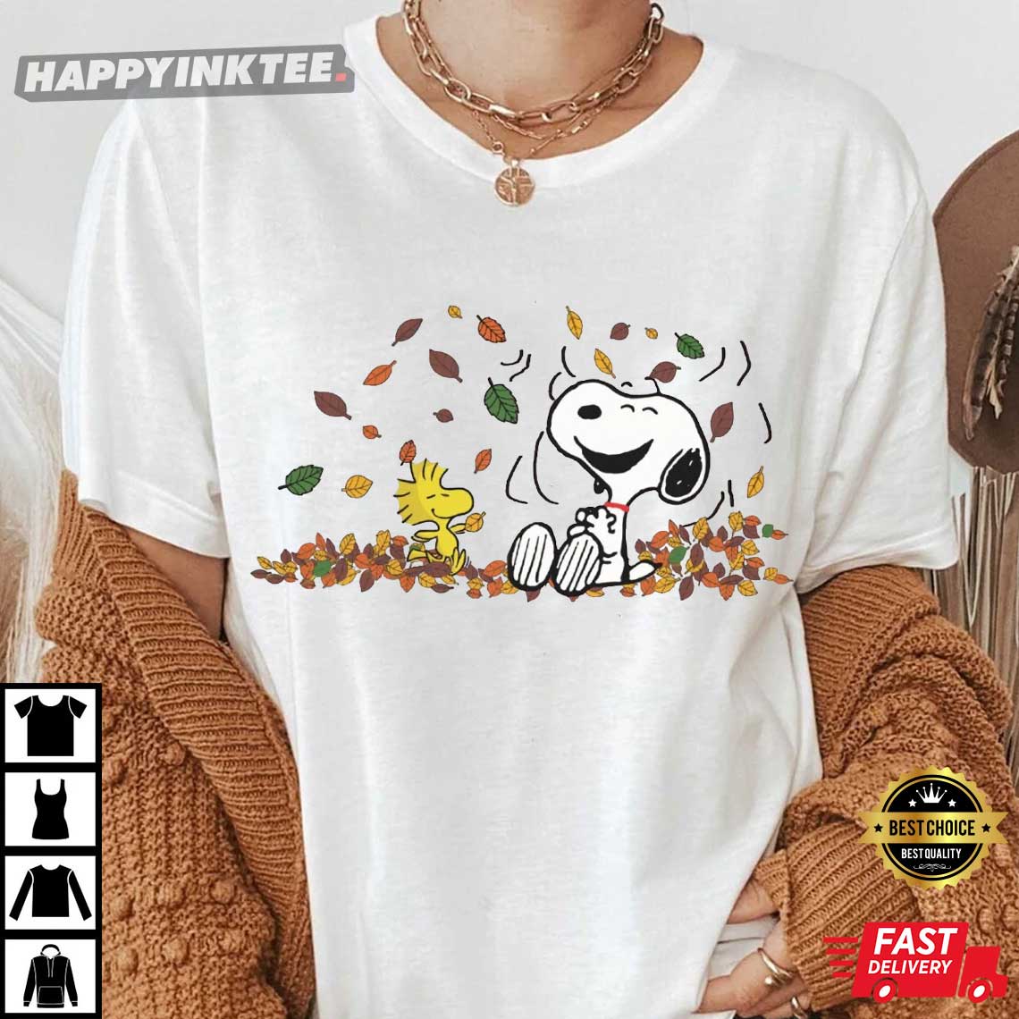 With the Fall Snoopy Retro Halloween Gift T-Shirt, you can enjoy the magic of fall. It shows Snoopy and Woodstock having a blast in a pile of falling leaves. It really brings out the cozy vibes of fall days, Halloween fun, and the warm spirit of the Peanuts crew.