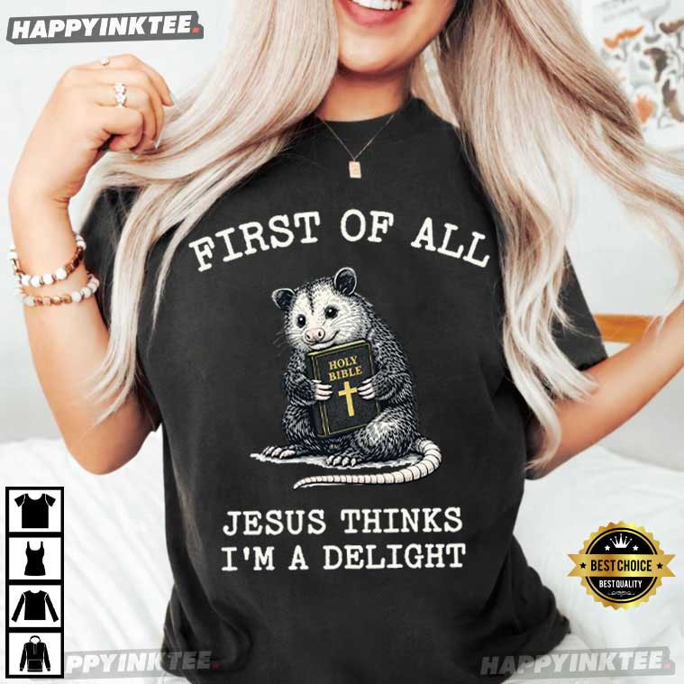 At the center of this design is an adorable opossum holding a Holy Bible, paired with the bold phrase: “First of all, Jesus thinks I’m a delight”