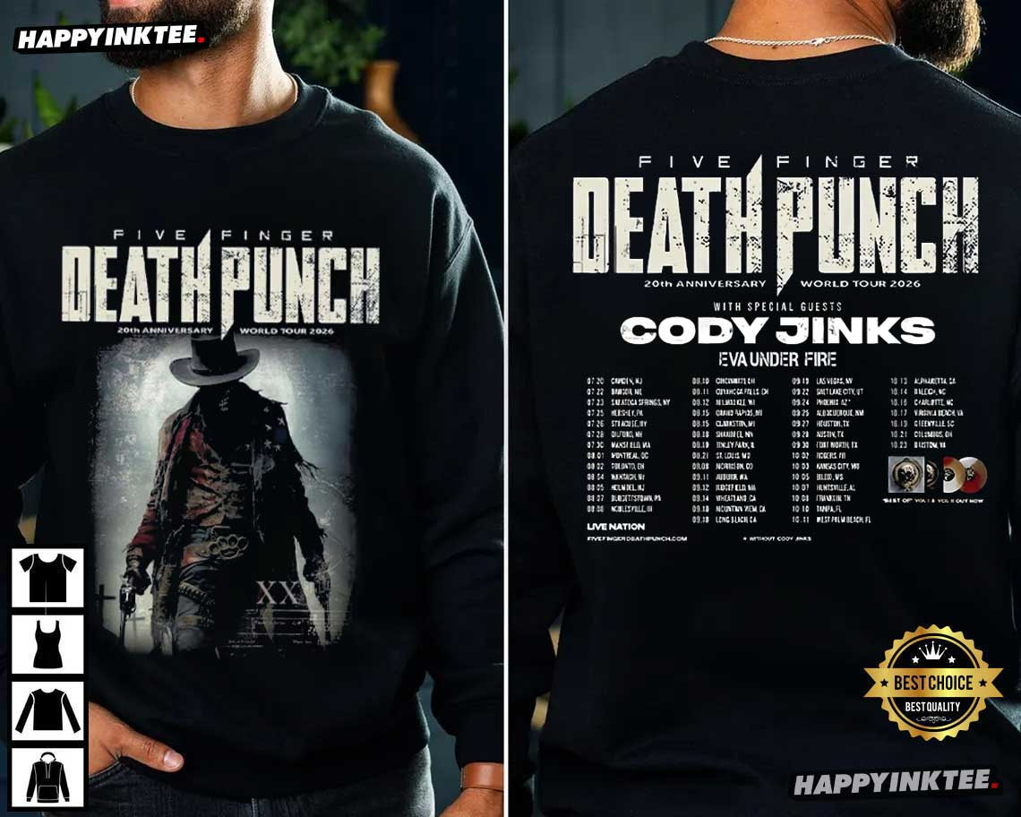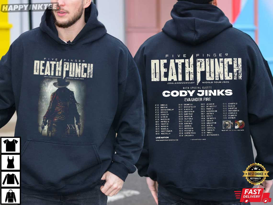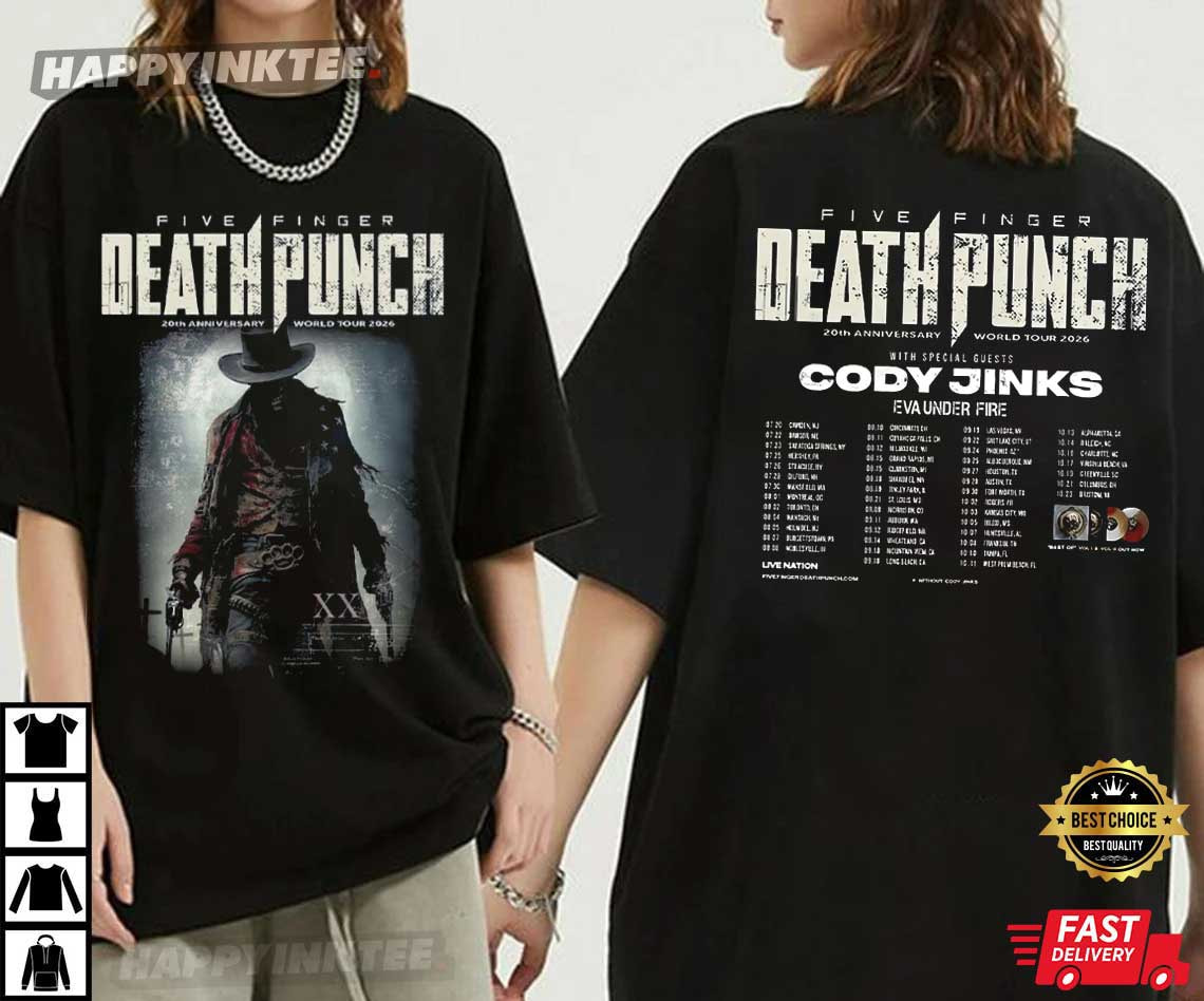 Bring together two powerful worlds of music with this Five Finger Death Punch World Tour 2026 With Cody Jinks T-Shirt—a bold concert-style design that celebrates the fusion of heavy metal intensity and outlaw country grit.