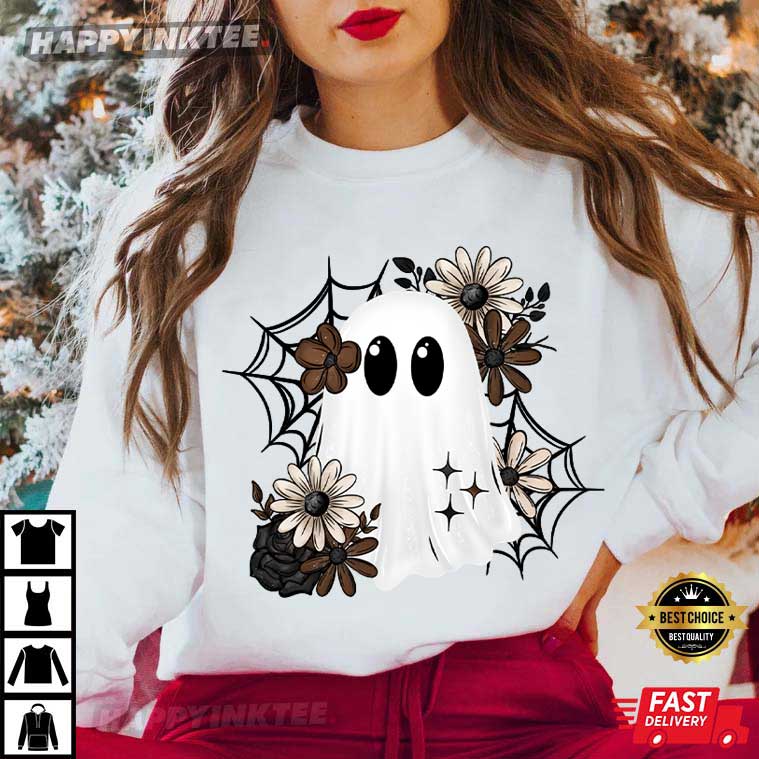 This cute ghost and flowers shirt shows a cute, kind of see-through white ghost with big, adorable eyes. The ghost hangs out with a cool mix of bohemian flowers and leaves in chill earthy colors like cream, beige, and black. A spiderweb graphic in the background totally nails the Halloween vibe, all set against a cozy, autumn-colored backdrop.