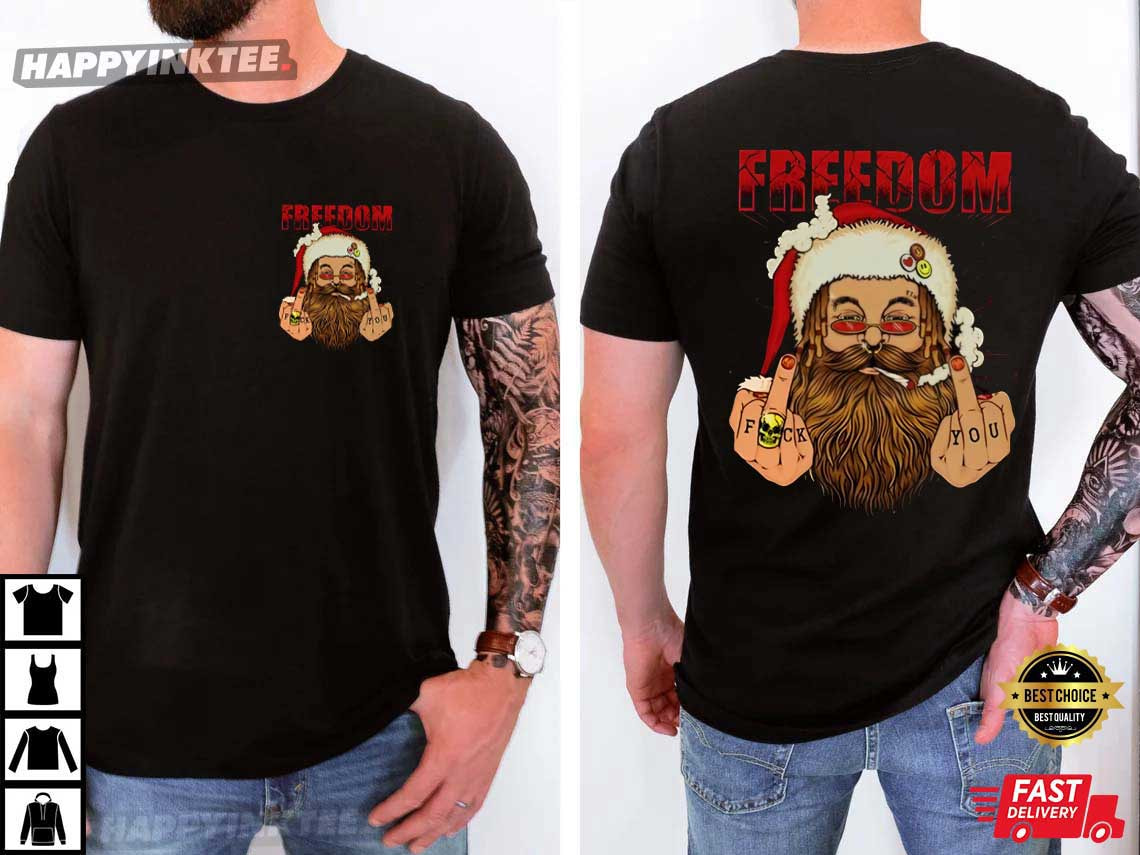 The Freedom-Defiant Minimalist Patriotic Santa Claus Bold patriotism and irreverent Christmas humor are combined in this Freedom Defiant Santa Claus Minimalist Patriotic Merry Christmas T-Shirt, perfect for those who prefer whiskey over cocoa and freedom over conformity. Featuring a laid-back Santa rocking shades, a long beard, and a pair of unapologetic hand gestures, this funny christmas shirt for men captures the spirit of rebellion wrapped in holiday cheer. It has a rough, vintage feel thanks to the distressed red “FREEDOM” font, and because of its simple form, it may be used every day outside of Christmas.