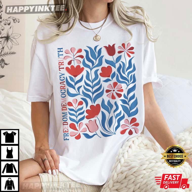 Want a shirt that shows your love for your country while also making you laugh? You should have the Freedom Democracy Subtle Anti Trump Patriotic T-Shirt! The bright flowery pattern on this white shirt has “FREEDOM DEMOCRACY TRUTH” in bold red, white, and blue. It’s great for the 4th of July or for silent dissent.
